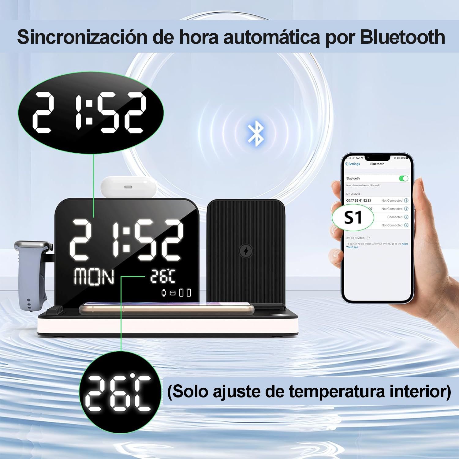 Conecta el cargador a la corriente usando el adaptador incluido y coloca tus dispositivos compatibles (teléfono, audífonos o reloj) sobre las zonas de carga inalámbrica. Los puertos USB adicionales permiten carga por cable cuando lo necesites. Ajusta brillo de la luz nocturna y revisa la hora/fecha de forma instantánea.